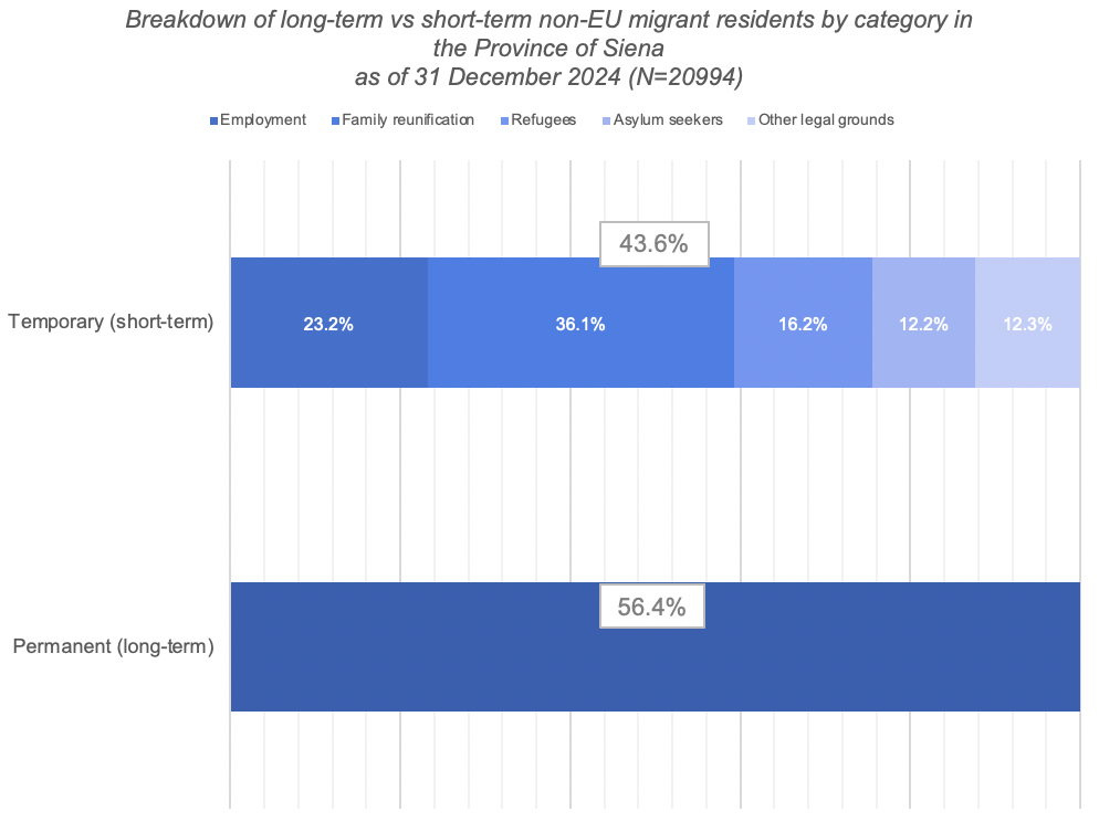 Of these 30660 migrant residents, 20994 are non-European migrants. Among them, 56.4% are long-term residents (permanent), while the remaining 43.6% are short-term residents (temporary) as shown by the bar chart below. Short-term migrants are further categorized according to their status or type of permit held, including family reunification, employment, refugees2, asylum seekers, and other legal grounds.