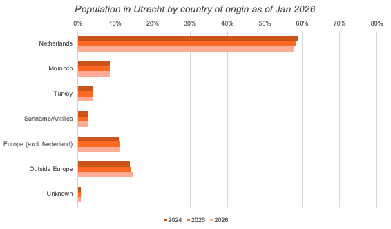 Utrecht has become an increasingly global city; as of Janurary 2026, over 40% of its population consists of residents with international roots. This upward trend reflects a growing global connection, with significant contributions from Moroccan (8.5%), Turkish (4.1%), and Surinamese or Antillean (2.9%) communities.
